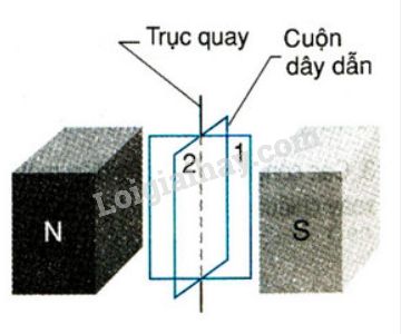 Khi cuộn dây quay từ vị trí 1 đến vị trí 2 thì số đường sức từ xuyên qua tiết diện S của cuộn dây tăng. Khi cuộn dây quay tiếp từ vị trí 2 thì số đường sức từ giảm. Nếu cuộn dây quay liên tục thì số đường sức từ xuyên qua tiết diện S luân phiên tăng giảm. Vậy dòng điện xuất hiện trong cuộn dây là dòng điện xoay chiều.