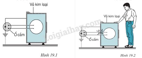 + Trong trường hợp ở hình 19.2, dây dẫn điện bị hở và tiếp xúc với vỏ kim loại của dụng cụ. Nhờ dây tiếp đất mà người sử dụng nếu chạm tay vào vỏ dụng cụ cũng không bị nguy hiểm. Hãy giải thích tại sao?
