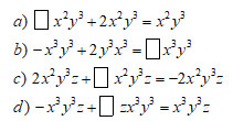 \(\eqalign{  & a)\,\,( – 1){x^2}{y^3} + 2{x^2}{y^3} = {x^2}{y^3}  \cr  & b)\,\, – {x^3}{y^3} + 2{y^3}{x^3} = 1{x^3}{y^3}  \cr  & c)\,\,2{x^2}{y^3}z + ( – 4){x^2}{y^3}z =  – 2{x^2}{y^3}z  \cr  & d)\,\, – {x^3}{y^3}z + \,2z{x^3}{y^3} = {x^3}{y^3}z \cr}\)