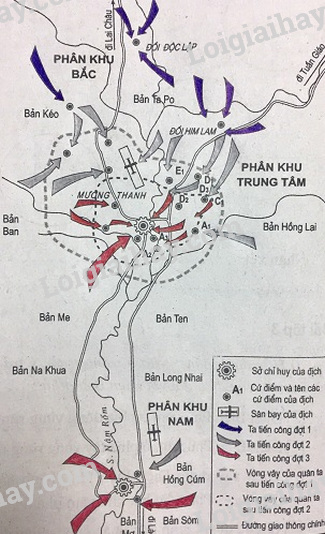 c) Trình bày diễn biến chiến dịch Điện Biên Phủ và tô màu vào các mũi tên tấn công của quân ta trong chiến dịch Điện Biên Phủ (đợt 1 – màu xanh, đợt 2 – màu vàng, đợt 3 – màu đỏ) theo lược đồ dưới đây:
