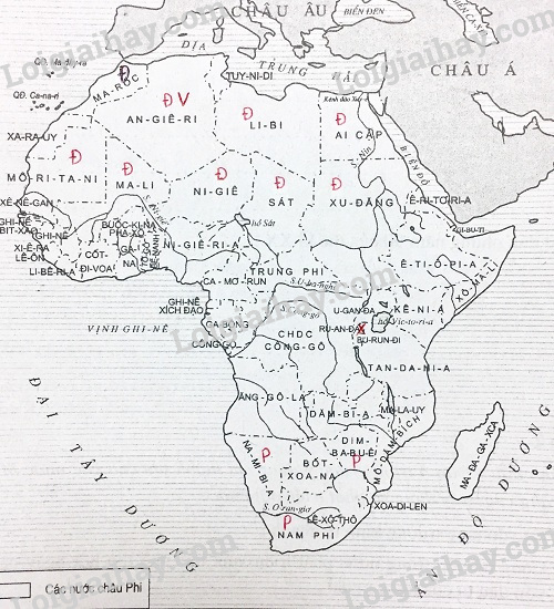 + Điền kí hiệu Đ ở: Các nước thuộc khu vực Bắc Phi: Ma-rôc, Ma-ra-uy, Mô-ri-ta-ni, Ma-li, An-giê-ri, Li-bi, Ni-ghê, Sát, Xu-đăng, E-ti-ô-pia, Ai Cập