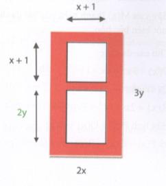 Một cánh cửa sổ bằng gỗ với kích thước là 2x và 3y. Bên trong cánh cửa, người ta gắn hai tấm kính. Tấm kính thứ nhất có kích thước là (x + 1) và (x + 1) và tấm kính thứ hai có kích thước là (x + 1) và (2y) (xem hình vẽ).