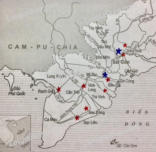a) Hãy dùng bút chì màu đỏ đánh dấu vào lược đồ (để trống) nơi quần chúng khởi nghĩa, màu xanh vào nơi thành lập chính quyền cách mạng trong khởi nghĩa Nam Kì.