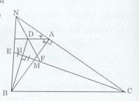 d) Đường thẳng BE cắt đường thẳng AC tại N. Tia phân giác \(\widehat {NAB}\) cắt đường thẳng BH tại D, tia ND cắt CM tại F. Tính số đo \(\widehat {NFC}\)