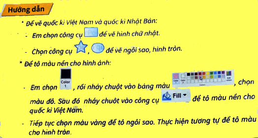 Giải phần bài tập thực hành trang 28, 29 sách bài tập hướng dẫn học tin học 4. Vẽ quốc kì Việt Nam và quốc kì Nhật Bản như hình mẫu. Lưu bài vẽ với tên "Viet Nhat" vào thư mục …