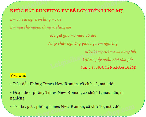 Em hãy gõ lại trích đoạn bài thơ sau, trình bày theo mẫu bên dưới rồi lưu tệp với tên “Khuc Hat Ru” vào thư mục em tự tạo.