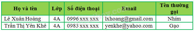 Em hãy chèn bảng ghi thông tin liên lạc của bạn theo mẫu sau vào văn bản :