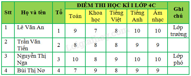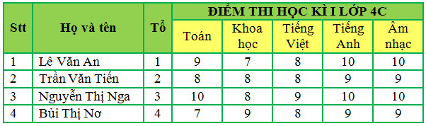 Em hãy chèn bảng điểm của lớp 4C theo mẫu sau rồi lưu lại với tên “bang diem”.