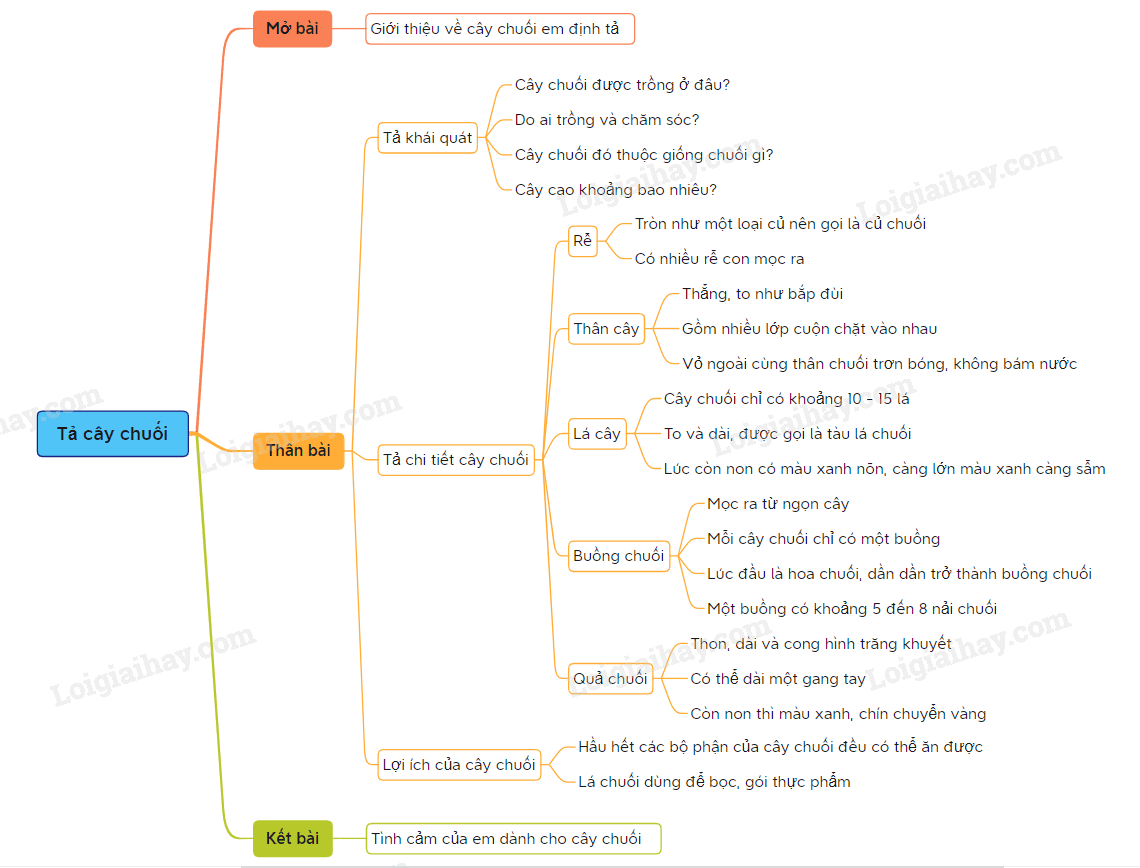 Em rất thích nhìn ngắm những cây chuối từ từ lớn lên, rồi ra hoa, kết quả. Chuối có quả quanh năm. Hoa chuối màu tím đậm, lúc đầu còn bé, từ từ lớn lên nghiêng hẳn về một bên. Rồi những bẹ hoa dần dần hé mở rồi tàn hơi, để lộ những quả chuối bé tí, màu trắng vàng hơi xanh, đầu còn gắn một bông hoa nhỏ, xếp sát nhau tạo thành nải chuối. Dần dần, quả chuối lớn dần, ngả sang màu xanh đậm. Cây chuối vì “đứa con” buồng chuối nặng chĩu mà nghiêng hẳn về một bên, nhưng vẫn gồng mình trước nắng gió nâng niu đàn con. Rồi ngày nó chờ đợi cũng đến, cả buồng chuối chín vàng, đưa hương bay xa.