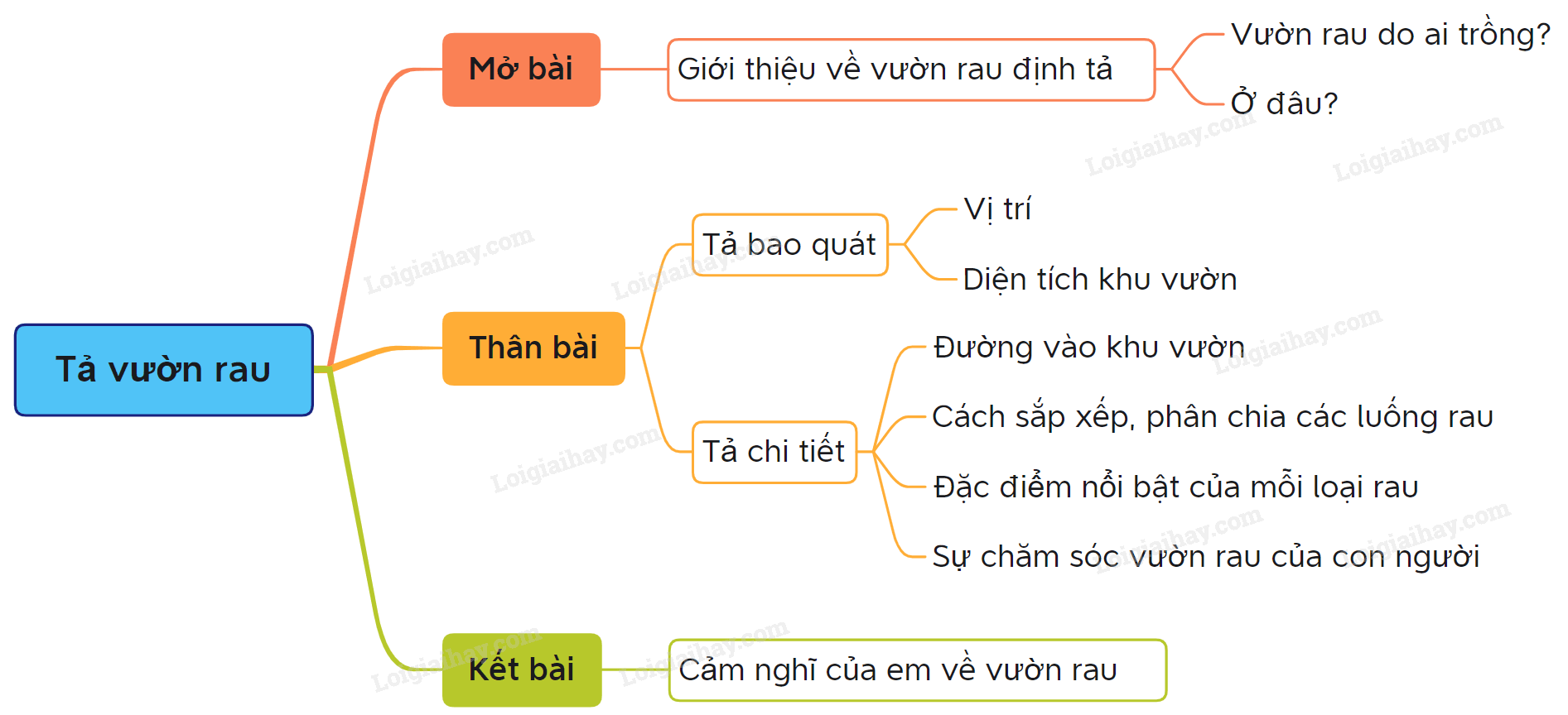 Vườn rau không lớn, chỉ khoảng 10m vuông, được bà rào quanh bằng gậy tre, tranh lũ gà, vịt hay chú Lích nhà em chạy vào quậy phá. Luống rau được phân thành nhiều vồng nhỏ song song với chiều rộng của luống. Cứ năm vồng lại cách một rãnh nhỏ rộng chừng một gang tay em, dùng làm lối đi lại trong luống để chăm sóc hoặc thu hoạch rau. Trong từng vồng, cải đã lên cao chừng hai mươi xen-ti-mét. Những cây cải xanh non, tươi roi rói dưới lớp sương mỏng ban sáng. Những ngọn lá phía dưới cùng to bản, hình bầu dục như những chiếc dép xanh xếp xòe tròn quanh gốc, là là trên mặt đất. Lớp lá phía trên là lá non, ngắn và nhỏ hơn, úp vào nhau như còn ngại ngùng nắng gió. Ở một số cây cải, hoa nở vàng rộ, năm cánh xòe rộng, rung rinh trước gió trông thật là đẹp.
