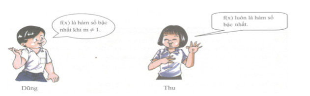 Bạn Dũng trả lời đúng. Vì khi hàm số \(y = ax + b\) là hàm số bậc nhất khi \(a \ne 0\) nên \(f\left( x \right) = \left( {m – 1} \right)x + 2\) là hàm số bậc nhất khi \( m – 1 \ne 0\) hay \(m \ne 1\)
