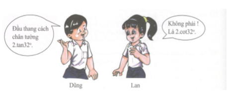 Dũng và Lan cùng dựng một cái thang hợp với tường một góc \({32^o}\). Chân thang cách chân tường 2 m.