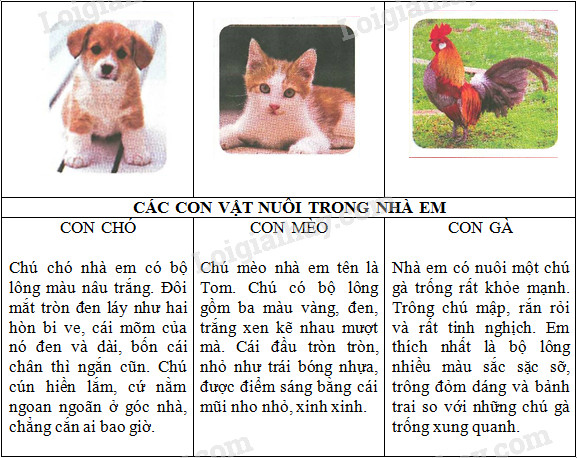 – Tìm kiếm hình ảnh rồi chèn lần lượt các hình ảnh chứ cún, chú mèo, chú gà vào 3 ô của dòng đầu tiên trong bảng.