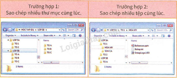 Để ý rằng ba thư mục trong trường hợp 1 là ba thư mục đứng liền kề nhau, còn hai tệp Baibaocao.pptx và OntapLogo.LGO ở trường hợp 2 không đứng liền kề nhau nên cách thực hiện có khác như sau: