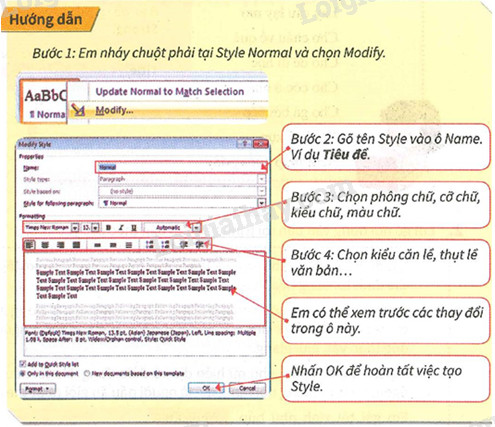 , đây là Style em đã chọn. Em hãy gõ một đoạn văn bản rồi trình bày đoạn văn theo Style em đã chọn đó.
