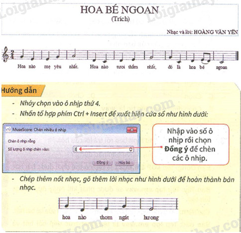 Bản nhạc sau chưa hoàn thiện vì còn thiếu các ô nhịp, em hãy chép bản nhạc Hoa bé ngoan rồi chèn các ô nhịp vào vị trí thích hợp, chép thêm nốt nhạc, gõ thêm lời để hoàn thiện bản nhạc đó.