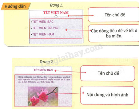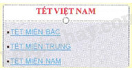 Trang 1: Trên chủ đề, phần nội dung có ba dòng lần lượt là TẾT MIỀN BẮC, TẾT MIỀN TRUNG, TẾT MIỀN NAM, khi nháy chuột vào từng dòng nội dung ở tranh này thì sẽ chuyển đến từng trang trình chiếu có nội dung giới thiệu tết ở miền đó.