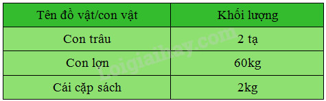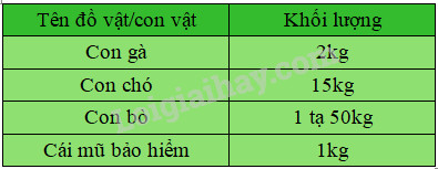 Bạn Hoàng đã lập bảng ghi lại số đo khối lượng của một số đồ vật và vật nuôi của nhà bạn như sau :