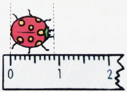 Em hãy quan sát hình vẽ dưới đây rồi viết các số thập phân thích hợp vào chỗ chấm. Nói cho mọi người trong gia đình nghe các thông tin về  chiều dài kiến và con bọ dừa trong hình vẽ.