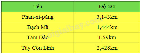 Bảng dưới đây cho biết độ cao của một số đỉnh núi ở Việt Nam :