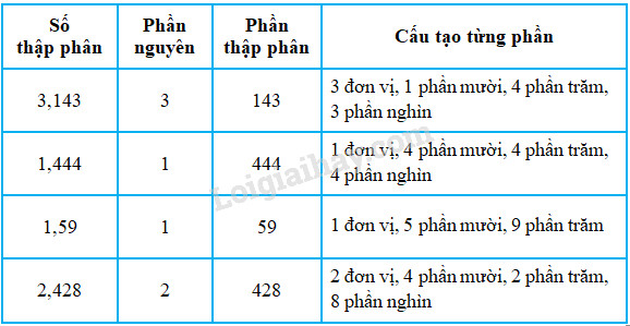 a) Các số thập phân có ở bảng đã cho là:   \(3,143\,\,;\,\,\,\,1,444\,\,;\,\,\,\,1,59\,\,;\,\,\,\,2,428.\)