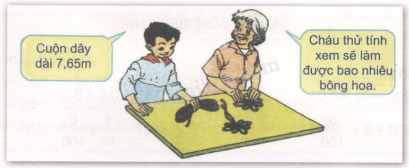 Bà có một cuộn dây dài 7,65m. Bà cắt thành các đoạn dây dài 0,85m để hai bà cháu kết các bông hoa, mỗi đoạn như thế kết được một bông hoa. Em hãy tính xem hai bà cháu làm được mấy bông hoa từ cuộn dây đó.