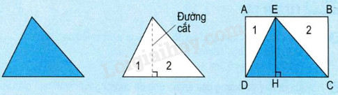 Bạn Hà có hai tờ giấy màu hình tam giác bằng nhau. Bạn Hà muốn cắt hai tờ giấy màu đó để ghép lại được một hình chữ nhật. Em hãy góp ý với bạn Hà để giúp bạn cắt ghép được hình chữ nhật đó.