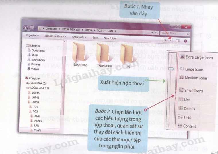– Ngoài cách mở thư mục trong ngăn phải đã học, bây giờ em biết thêm cách mở thư mục từ ngăn trái trong cửa sổ Computer.