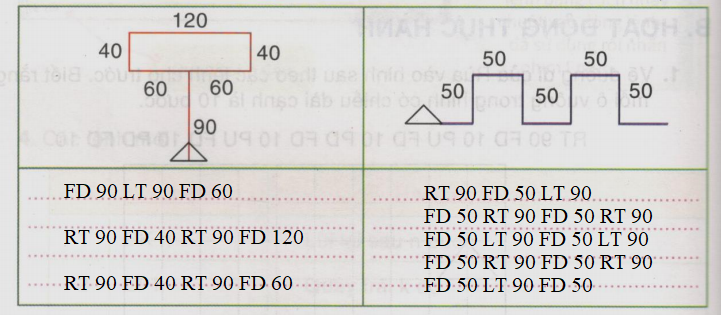 Chọn màu bút, nét bút rồi viết các lệnh để Rùa vẽ các hình có các bước theo mẫu, ghi các lệnh đã viết vào chỗ chấm (. . .)