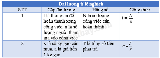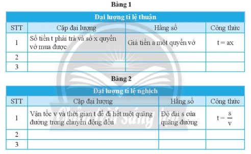 – Nhóm trưởng phân công một số bạn trong nhóm tìm các đại lượng tỉ lệ thuận và tỉ lệ nghịch trong thực tế để ghi vào hai bảng.