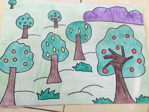 – Em tạo ra sự lặp lại của chấm, nét bằng cách vẽ thêm quả vào trong cây, nét cong dưới mặt đất, bụi cỏ xen kẽ vào mô đất.