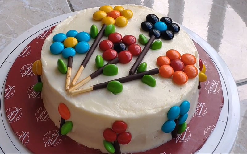 + Cuối cùng là những cánh hoa, lá, nhụy đều được trang trí bằng những viên kẹo hình tròn, tạo nên sự tròn đầy, bóng bẩy, hấp dẫn của chiếc bánh.