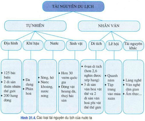 Căn cứ vào Atlat Địa lí Việt Nam, hình 31.5 và sơ đồ sau, hãy trình bày về tài nguyên du lịch nước ta ?