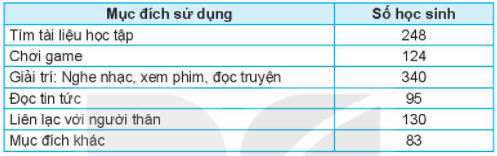 Các bạn An, Minh, Khoa thực hiện khảo sát về việc sử dụng mạng Internet. Phiếu được phát ra cho 1 020 học sinh trong trường, sau khi thu phiếu và tổng hợp lại có kết quả như sau: