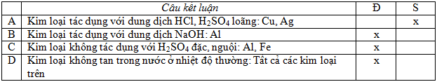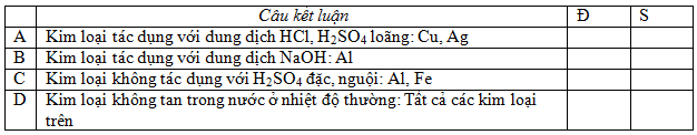 Cho các kim loại: Fe, Cu, Ag, Al, Mg. Đánh đấu x vào ô Đ nếu kết luận đúng và ô S nếu kết luận sai: