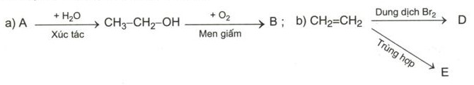 a){C_2}{H_4}\xrightarrow[{xt}]{{ + {H_2}O}}C{H_3} – C{H_2} – OH\xrightarrow[{men\,giam}]{{ + {O_2}}}C{H_3}COOH \hfill \\