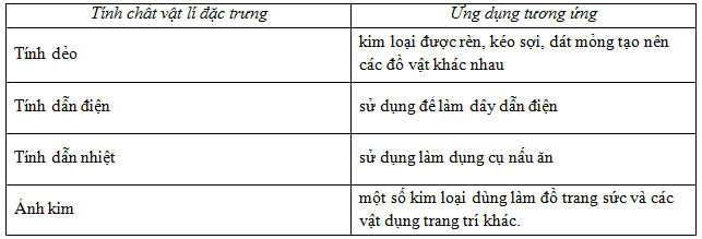 Những tính chất vật lí đặc trưng và những ứng dụng tương ứng của kim loại.
