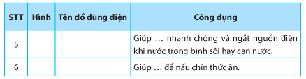 Sử dụng các cụm từ sau để gọi tên và mô tả công dụng của những đồ dùng điện trong gia đình tương ứng ở các hình dưới đây (điền vào Bảng 10.1)
