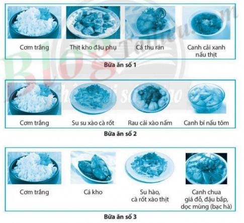Ba bữa ăn được cung cấp như sau: Nhận xét mức độ dinh dưỡng trong mỗi bữa ăn bằng cách đánh dấu vào bảng theo các kí hiệu: +: vừa đủ + +: thừa -: thiếu