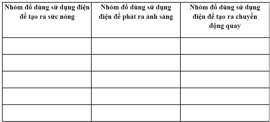 Quan sát các đồ dùng điện trong gia đình em và liệt kê chúng vào mỗi nhóm ở bảng sau