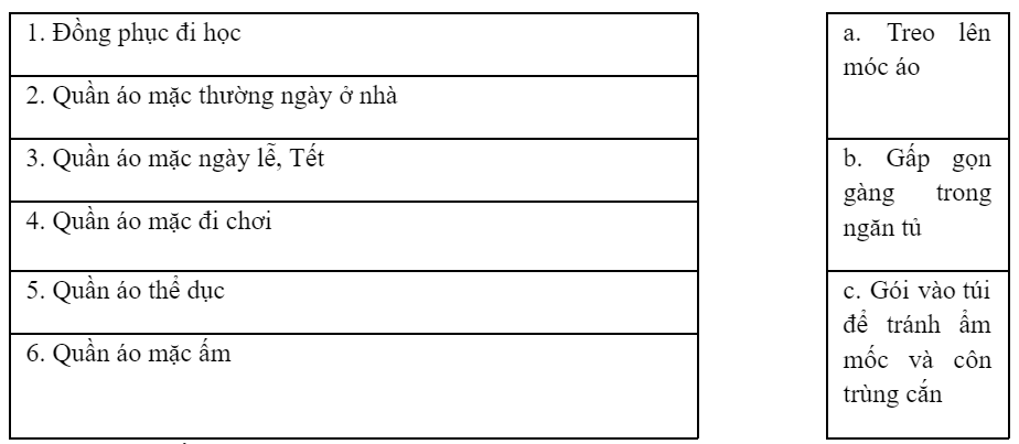 Nối tên các loại trang phục với cách cất giữ cho phù hợp