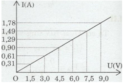 Khi \(U = 4,5V\) thì \(I = 0,9A\)