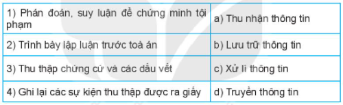 Trong truyện “Cuộc điều tra màu đỏ", sau khi thu thập các chứng cứ, thám tử Sherlock Holmes đã lập luận để chứng minh Jefferson Hope là thủ phạm của vụ án. Hãy ghép mỗi hành động ở cột bên trái của thám tử với một hoạt động xử li thông tin phù hợp ờ cột bên phải.