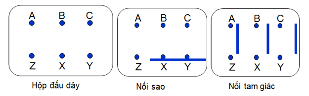 Các dây quấn stato được đưa ra hộp đấu dây đặt ở vỏ động cơ như hình: