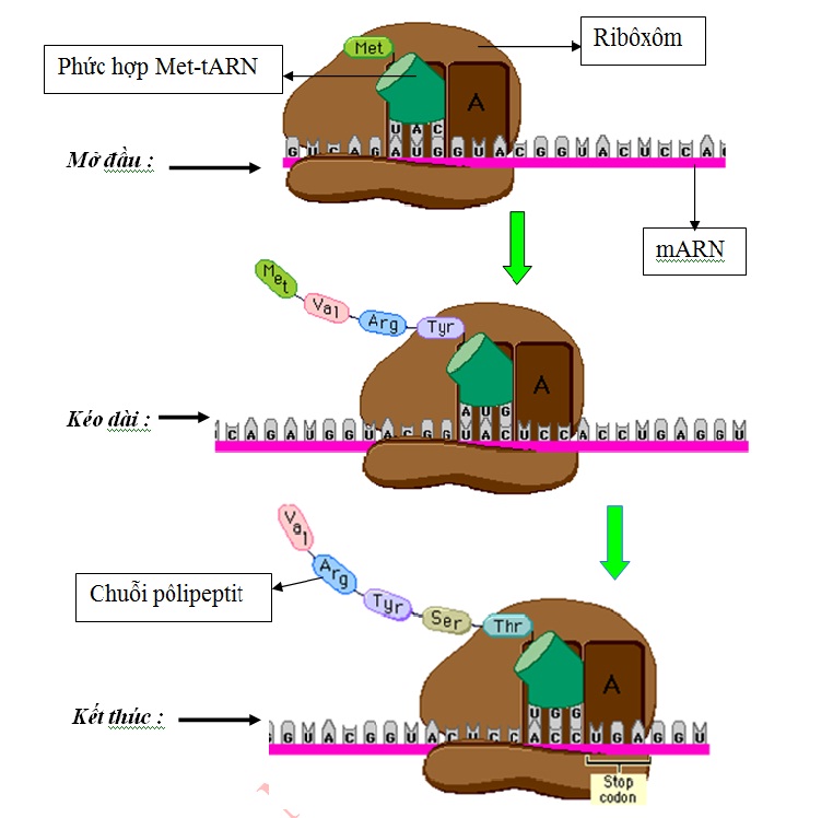 Quá trình tổng hợp chuỗi polipeptit diễn ra theo ba bước: