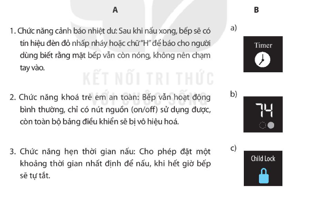 Ghép chức năng thông minh của bếp hồng ngoại ở cột A với kí hiệu tương ứng ở cột B sao cho phù hợp: