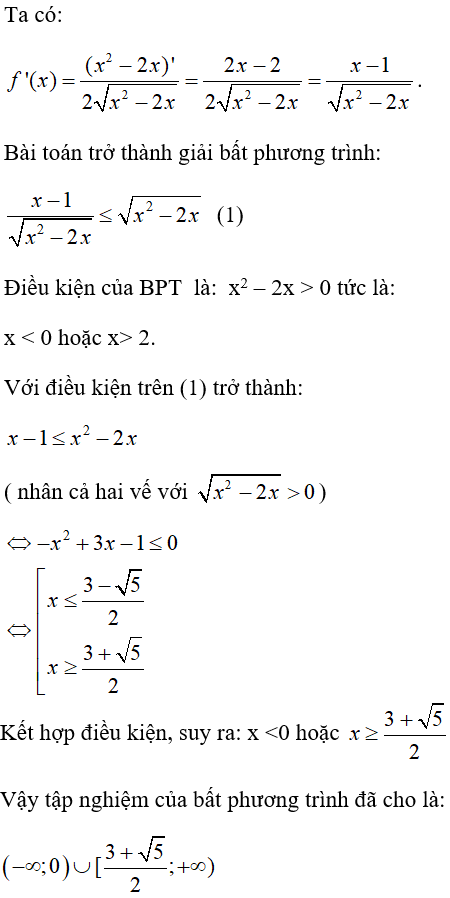 Cho hàm số \(f\left( x \right) = \sqrt {{x^2} – 2x} \) . Hãy giải bất phương trình \(f’\left( x \right) \le f\left( x \right)\)