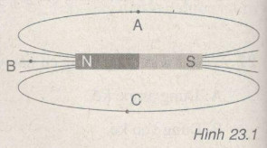 Hãy vẽ kim nam châm nằm cân bằng ở các vị trí A, B, C trong từ trường của thanh nam châm thẳng (Hình 23.1)
