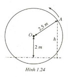 Một chiếc guồng nước có dạng hình tròn bán kính \(2,5m\) ;trục của nó đặt cách mặt nước \(2m\) (h.1.24). Khi guồng quay đều, khoảng cách \(h\) (mét) từ một chiếc gầu gắntại điểm \(A\) của guồng đến mặt nước được tính theo công thức \(h = |y|\), trong đó