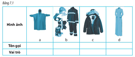 Sử dụng các cụm từ sau để gọi tên và mô tả vai trò chính của những trang phục tương ứng trong Bảng 7.1.
